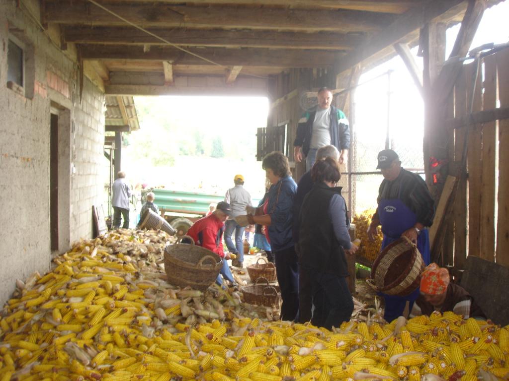 Jusovi imajo moderno in strojno opremljeno kmetijo, vendar vsako leto prav posebej posadijo njivo kroruze, ki je primerna za ročno trganje in kožuhanje. Babica Marija se potrudi in vanjo posadi nekaj zares domače koruze, da imajo v jeseni kožuhači veselje z iskanjem rdečih koruznih storžev. Ročno spravljanje koruze je že skoraj spomin na stare običaje, na jesensko opravilo v Halozah. Letos je koruza zgodaj dozorela in tako se je spravilo že pričelo in bo kaj kmalu končano, saj nas je narava obdarila z lepim jesenskim vremenom. Ko koruza primerno dozori, storže ročno potrgajo in jih s košarami znosijo na vozove ter odpeljejo domov. Na gričevnatih predelih pa še ponekod potrgano koruzo znosijo s koši domov. Zasipljejo jo v kolarnici na kup. Proti večeru pa so se kožuhači posedli na kup potrgane koruze, malo starejši in vezači pa na nizke stolčke okrog njega. Kožuhanje pa ni samo delo, je prav prijetno opravilo, ki se ga radi udeležijo poleg domačih tudi sosedje in prijatelji. Hitro mine čas ob pripovedovanju šal, ob katerih te od smeha boli trebuh. Zapele so tudi ljudske pevke in zaigrali ljudski godci Haloški veseljaki TD Podlehnik. Vse navzoče pa je pozdravil predsednik društva Milan Vidovič. Kožuhanje je pravo veselje in priložnost za veselo druženje pa še marsikaj mladina sliši od starejših, od starih pesmi, starih zgodbic do zanimivih vicev, ki privabijo na usta prešeren smeh. Ob vsem tem seveda ne manjka pijače, ob zaključku pa še pogostitev z večerjo in za posladek dišeče pečeni kostanj, brez katerega kožuhanje ne mine.